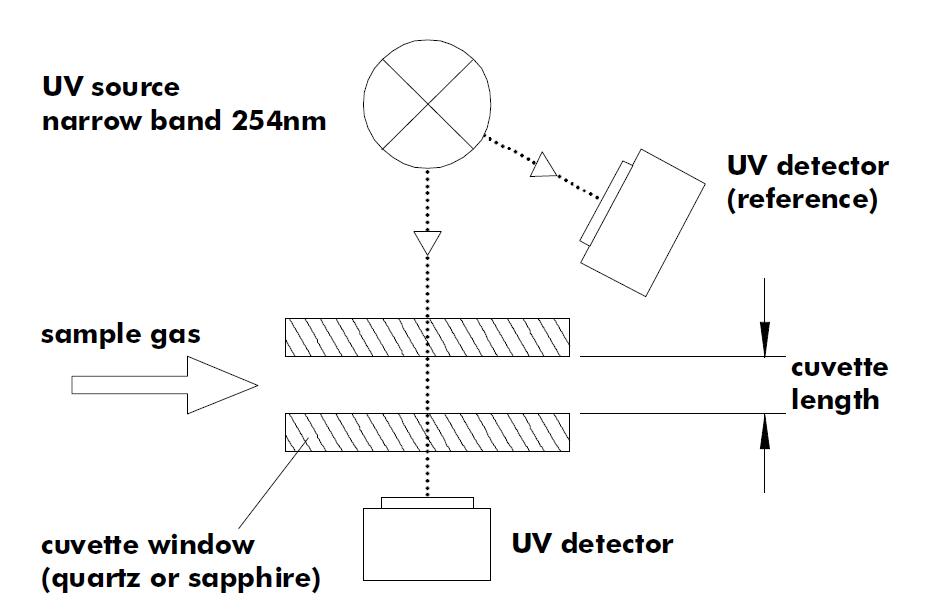 紫外線輻射由兩個(gè)不同的紫外線探測器測量。一個(gè)探測器稱為參考探測器,測量通過比管前的輻射,另一個(gè)探測器測量通過比管后的輻射,以及通過比管中包含的樣品氣體的輻射。