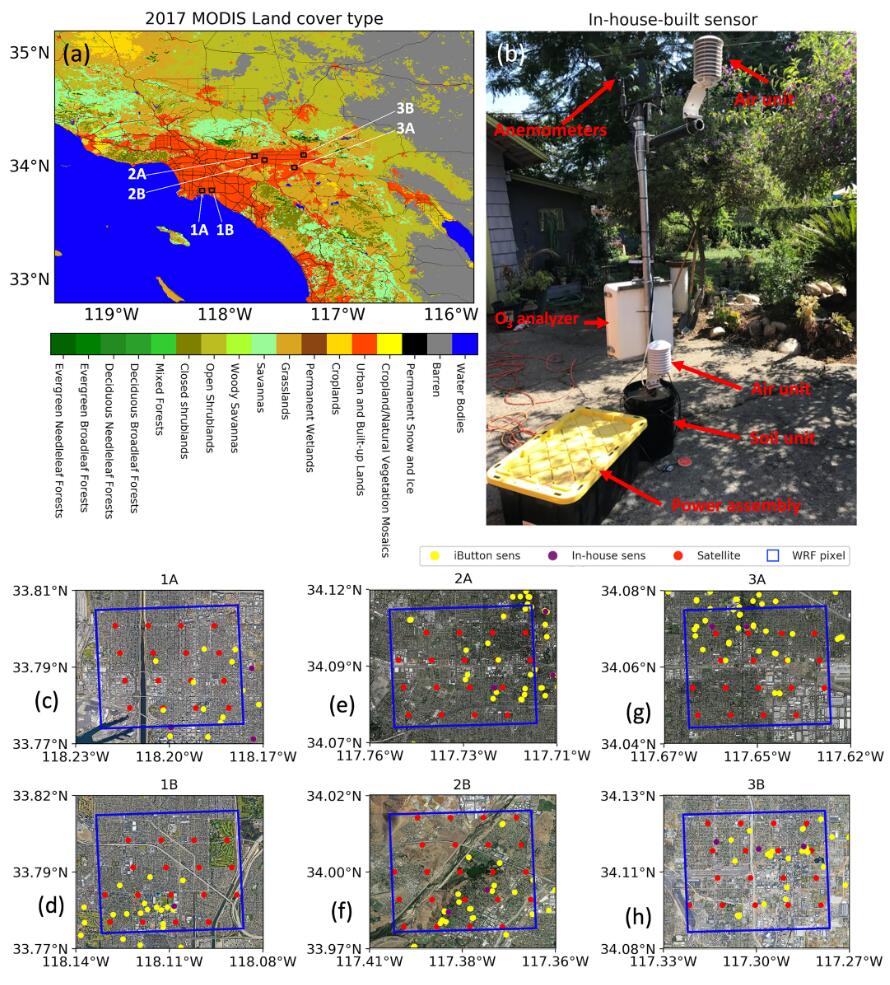 我們?cè)O(shè)計(jì)了我們的研究,以評(píng)估2017 年夏季從單個(gè)地塊到洛杉磯大都市區(qū)(圖 1a )的多個(gè)尺度的溫度和 O 3變化。我們圍繞單個(gè)社區(qū)組織了傳感器部署,我們將其定義為 4 × 4 km 2樣方. 密集的現(xiàn)場(chǎng)部署集中在加利福尼亞州長(zhǎng)灘和內(nèi)陸帝國(guó)的各個(gè)部分(圖 1c-1h),這是洛杉磯大都市地區(qū)的一個(gè)子集,嚴(yán)重未達(dá)到 O 3. 部署持續(xù)時(shí)間分為三個(gè)活動(dòng)。在 2017 年 6 月至 7 月的第一次活動(dòng)中,六個(gè)傳感器節(jié)點(diǎn)被分布到長(zhǎng)灘附近距離小于 20 公里的兩個(gè)樣方(每個(gè)樣方三個(gè)傳感器節(jié)點(diǎn))(例如,圖 1中的樣方 1A 和 1B) . 通過這種設(shè)計(jì),樣方大小可與空氣質(zhì)量模型和 EPA 排放清單的標(biāo)稱空間分辨率相媲美,后者通常為 4 × 4 km 2,而兩個(gè)樣方之間的距離可與 TROPOMI 足跡的尺寸相媲美( 4 × 7 公里2) 在最低點(diǎn)。因此,社區(qū)科學(xué)網(wǎng)絡(luò)的分布非常適合進(jìn)行測(cè)量,以解決有關(guān)亞網(wǎng)格尺度模型不確定性和亞像素分辨率衛(wèi)星檢索不確定性的問題。2017 年 7 月至 8 月的第二次活動(dòng)和 2017 年 8 月至 9 月的第三次活動(dòng)的部署與第一階段的部署類似,但針對(duì)克萊蒙特(圖 1中的 2A 和 2B )和圣貝納迪諾(3A)附近的不同樣方和3B),分別。當(dāng)兩個(gè)樣方在項(xiàng)目的每個(gè)階段配對(duì)以測(cè)量子區(qū)域梯度預(yù)期溫度和 O 3時(shí),項(xiàng)目所有三個(gè)階段中的鄰域?qū)Χ急贿x擇以共同反映區(qū)域梯度。